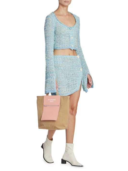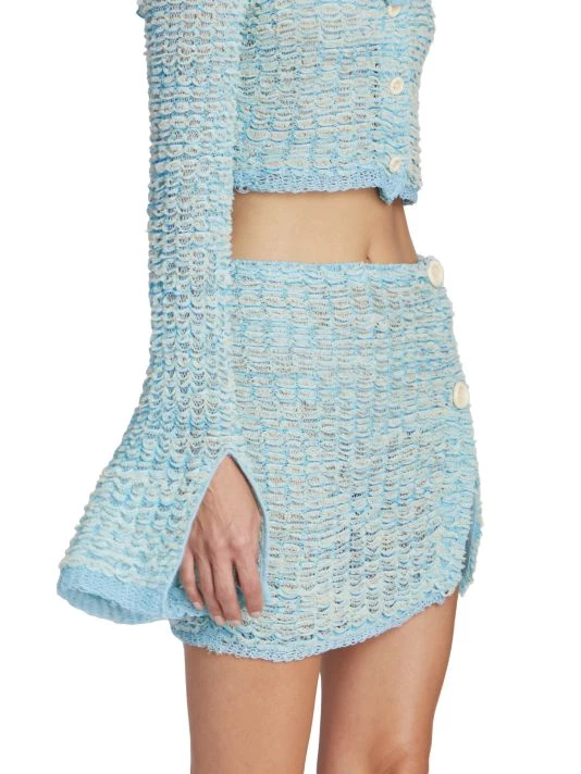 Openwork knit mini-skirt with contrast button closures and a high front slit.