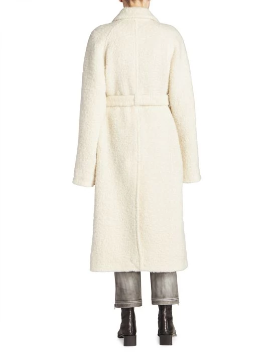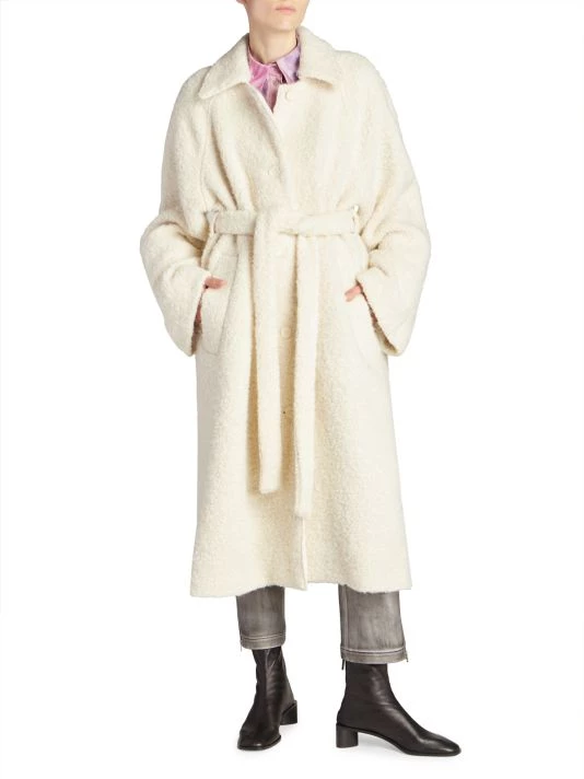 Referencing Acne Studios’ roots, this collection reflects Jonny Johansson’s signature use of reinvented denim and sumptuous leather. The Swedish label showcases patchwork swatches paired with oversized silhouettes and draped details this season. This chic Olaura alpaca-blend coat features a boucléstyle design, belted at the waist for added dimension.