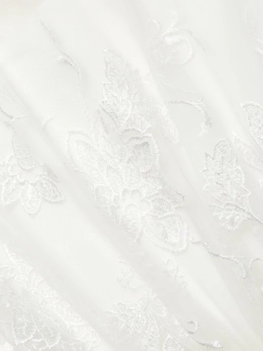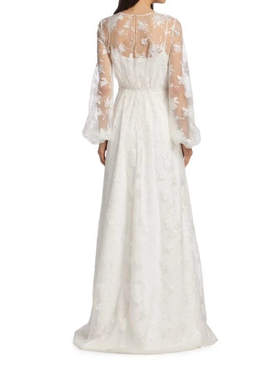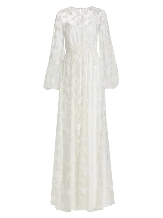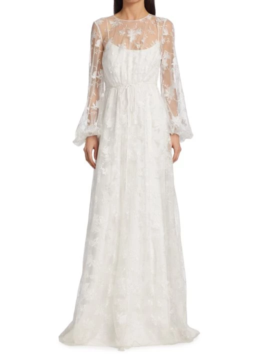 This embroidered tulle evening gown from ML Monique Lhuillier features an illusion scoop neck with sheer blouson sleeves and a slip lining. The romantic style is complete with a tie-waist detail.