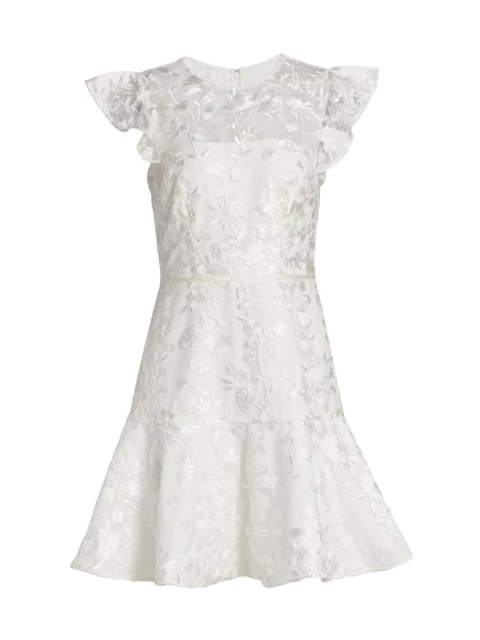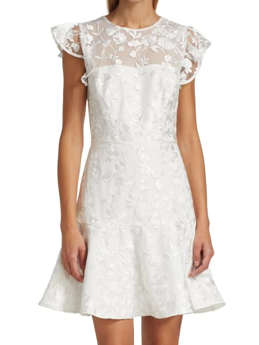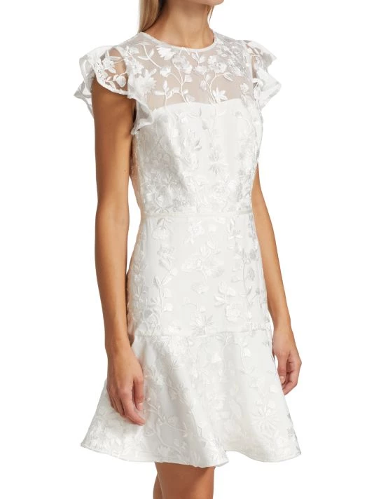 Sweet fit-and-flare minidress with an illusion neckline and flutter sleeves, embroidered with a tonal floral motif that extends to flounce hem.