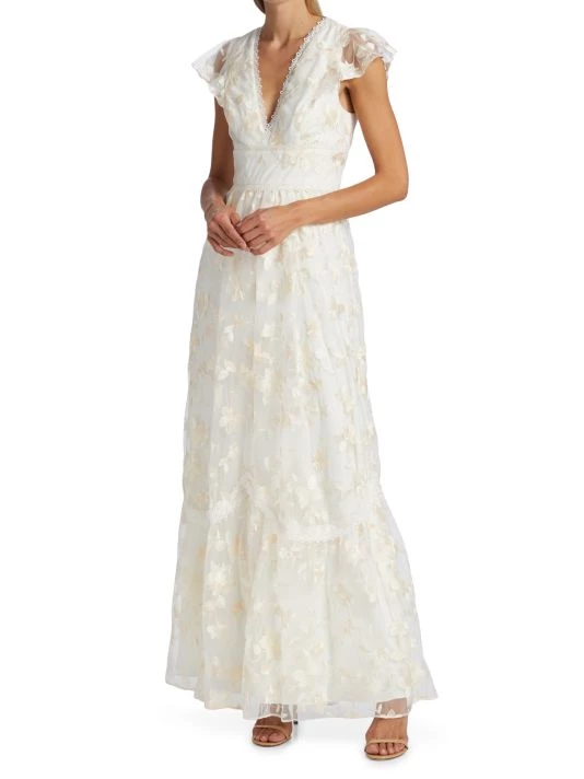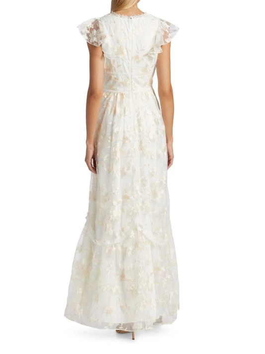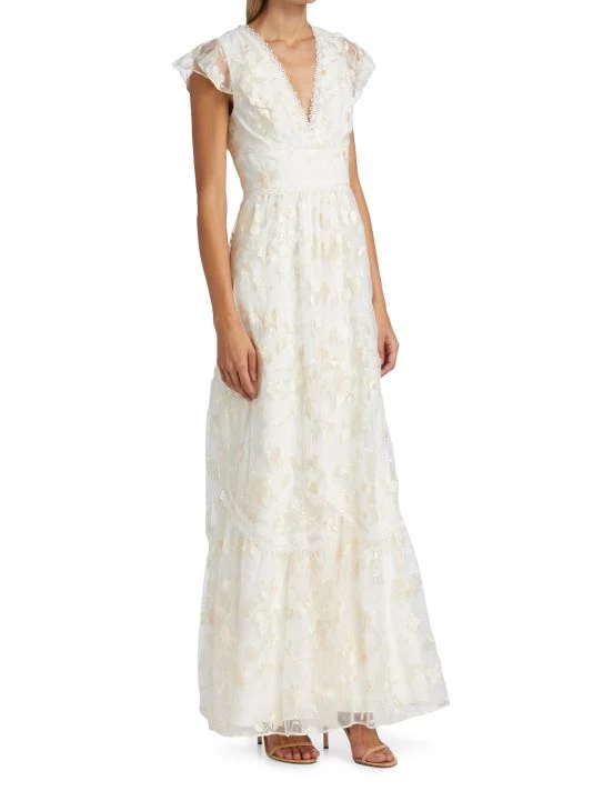 Romantic gown with feminine flutter sleeves and exquisite floral embroidery.