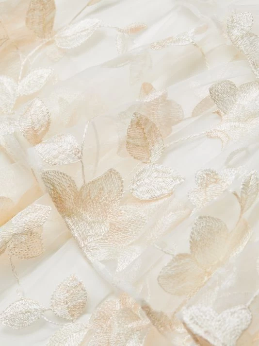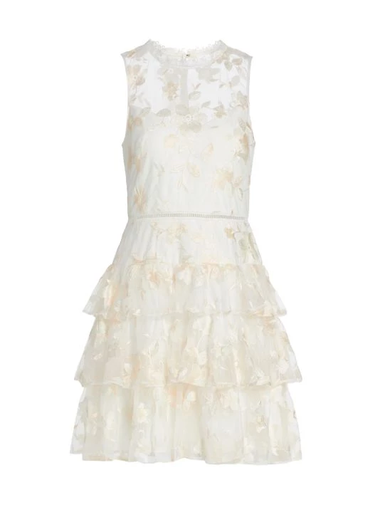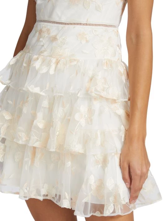 Flirty ruffle dress elevated with exquisite floral embroidery.