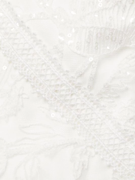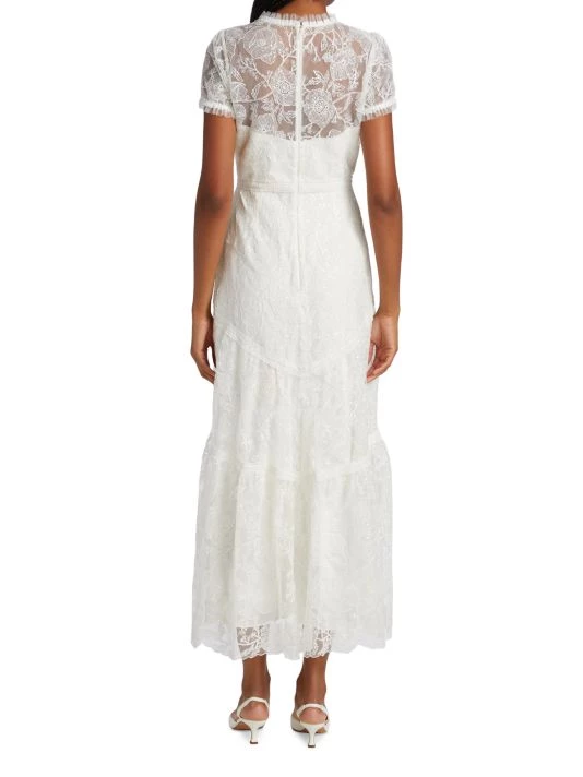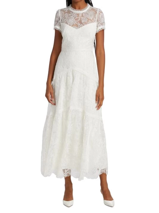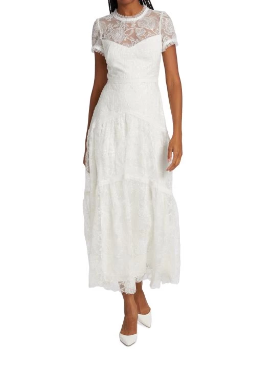 Delicate lace dress with romantic illusion neck with sweetheart design frilled at neckline and cuffs, ending in a tiered skirt.