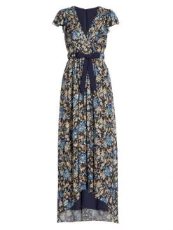 This metallic floral maxi dress features a plunging V-neck and self-tie bow at the waist.