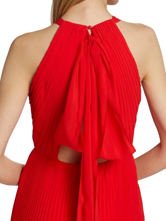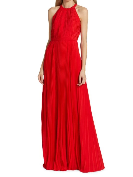 This Monique Lhuillier halter neck gown is crafted of flowingpleated chiffon. A back cutout with an oversized bow detail adds drama to this classic silhoutte.