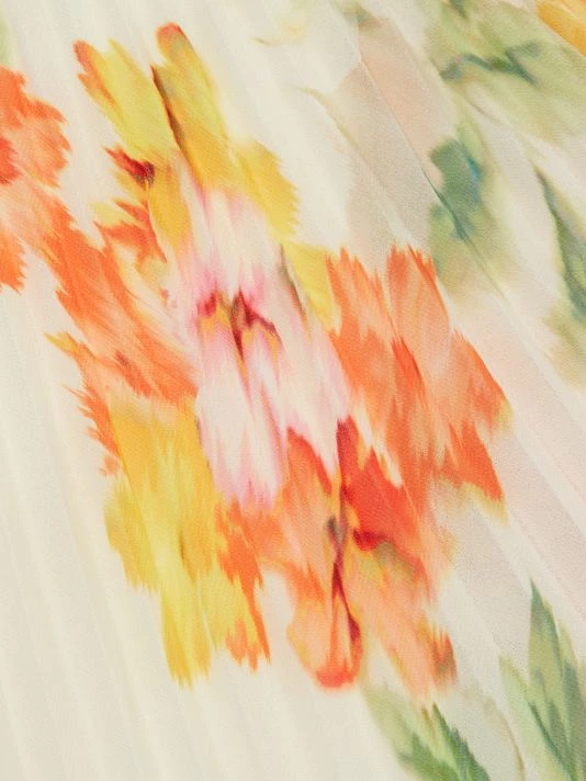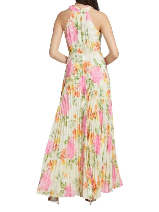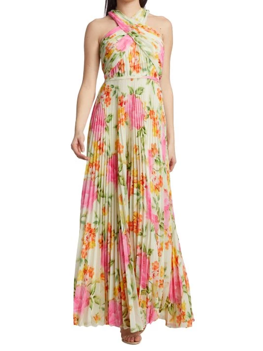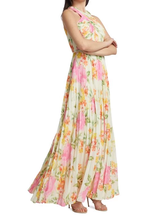 Crafted of floral-print chiffon, this ML Monique Lhuillier maxi dress features a fitted, cross halterneck bodice with a banded waist. A flowing pleated skirt completes this romantic look.