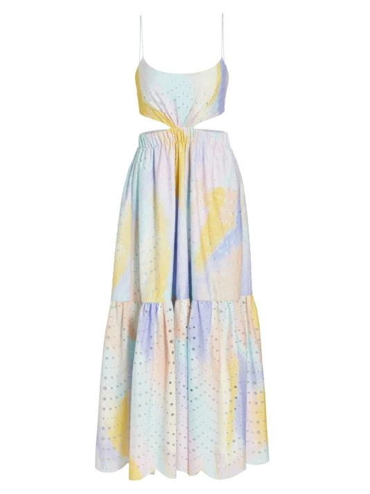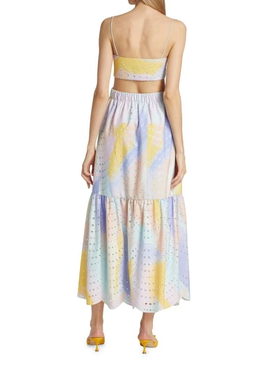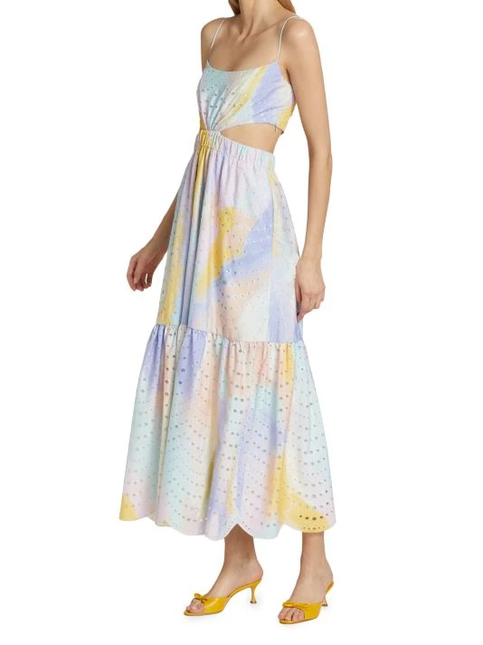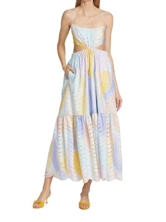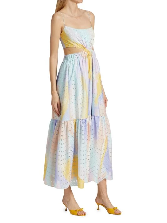 Decorated with intricate eyelet embroidery, ML Monique Lhuillier’s fit-and-flare dress is enhanced with flattering waist cutouts.