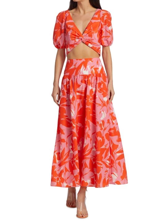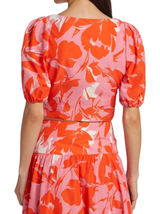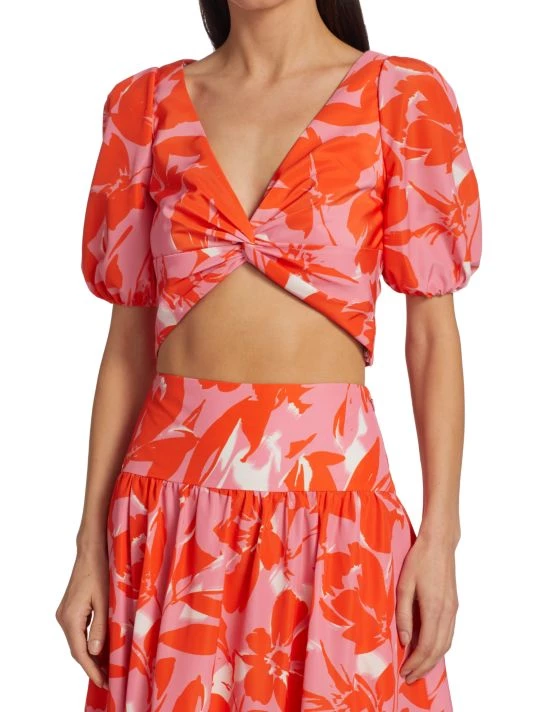 This printedtaffeta ML Monique Lhuillier crop top features a V-neck twist-front bodice and short puff sleeves.