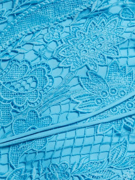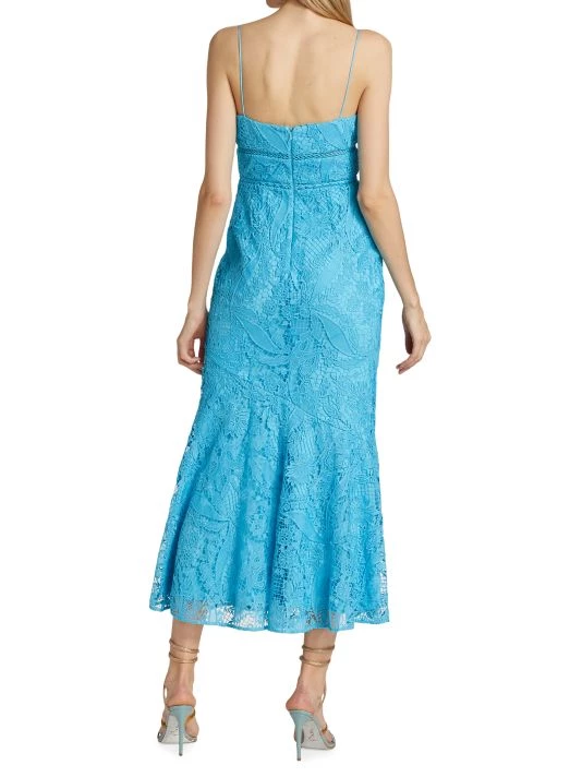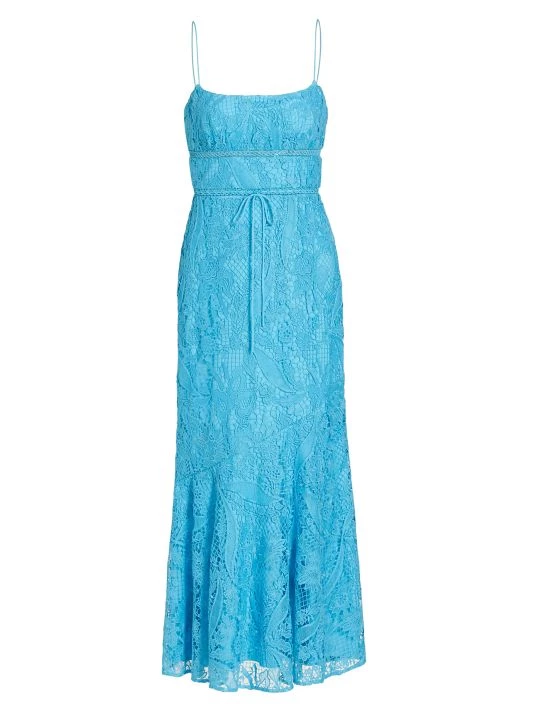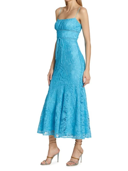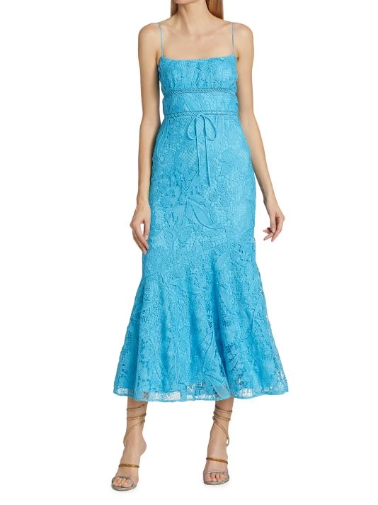 This Monique Lhuillier midi-dress is crafted of intricate floral guipure lace. Braided waist accents and a front tie detail complete this trumpet-style silhouette.