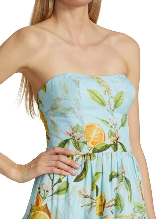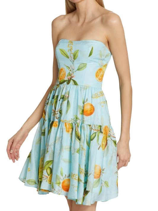 Crafted of a luxurious linen blend, ML Monique Lhuillier’s strapless dress is designed with a voluminous tiered skirt.